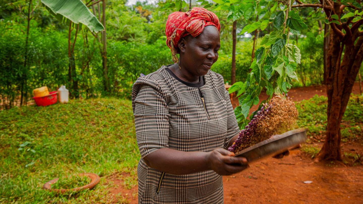 Rosaline holds soybeans—a value-added crop introduced through training and support from iDE Kenya as part of the She Feeds Africa program.